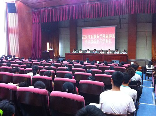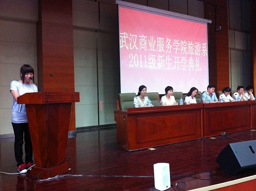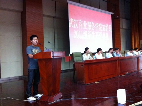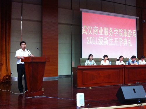 薛兵旺教授从八个方面介绍了旅游系的办学特色:办学历史长、发展速度快、形成了重点品牌专业、双师队伍优良、实践教学基础扎实、毕业生受欢迎、社会服务功能强、专业发展前景广阔;最后对新生提出了三点期盼:一是明确目标、学好做好;二是注意礼仪,服务社会;三是心怀理想,飞得更高!
