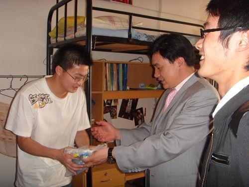 各小组老师带着夏季防蚊花露水、蚊香、洗手液等生活用品和浓浓的爱生之情,与学生“亲密接触”,受到学生们的热烈欢迎。寝室里,老师与同学亲切交谈,了解他们的学习生活情况,帮助他们解决遇到的问题,并送上了节日的祝福。